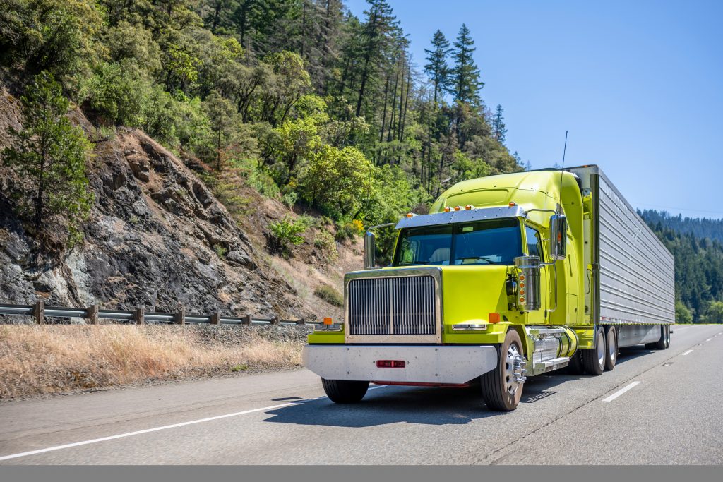 Bright lime stylish industrial grade long haul Big rig bonnet semi truck transporting frozen commercial cargo in refrigerator semi trailer running for delivery on the one way multiline highway road